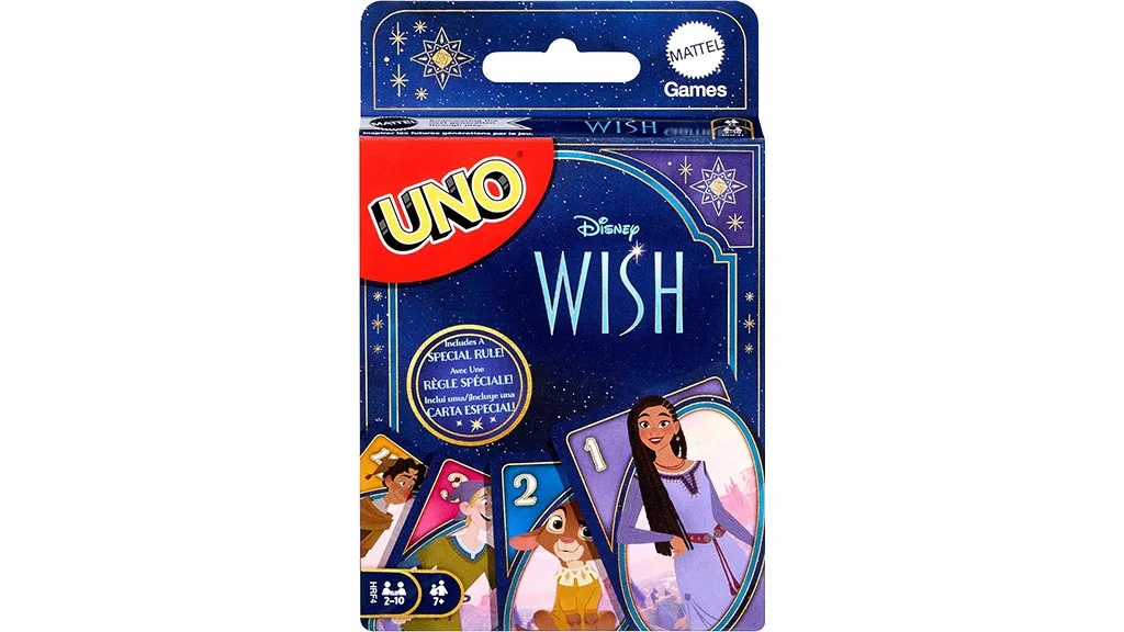 Nejnovější film Disney se objevuje v jedné z klasických her Mattel. Tato verze Uno obsahuje ilustrace všech různých postav Wish, včetně Asha, Valentino, Dahlia a mnoho dalších!