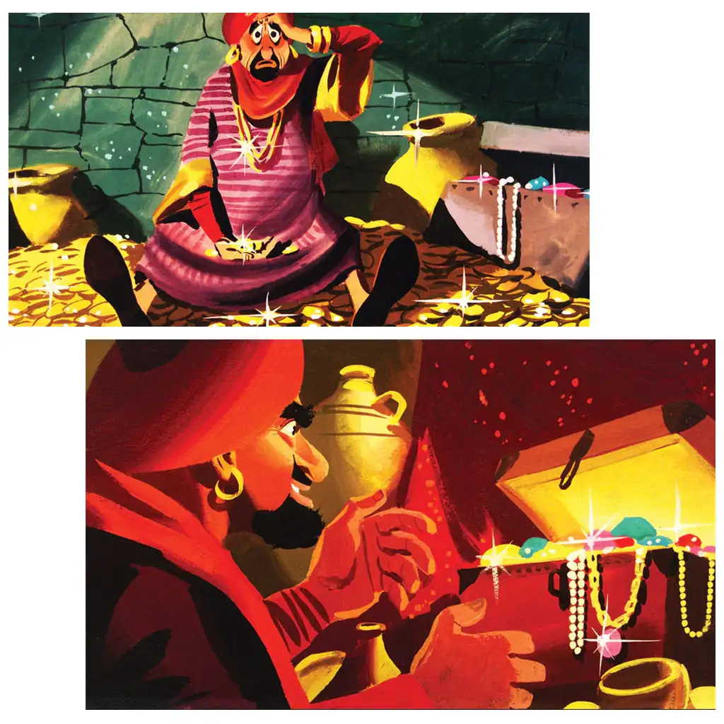 Během příběhu Ali Baba chytře a mazaně využívá svého objevu a sdílí poklady. Zajímavým detailem je také, proč Ali Baba dává služku za ženu svému synovi. Ilustrace vytvořil Sándor Lengyel, čímž přispěl k vizuální přitažlivosti příběhu.