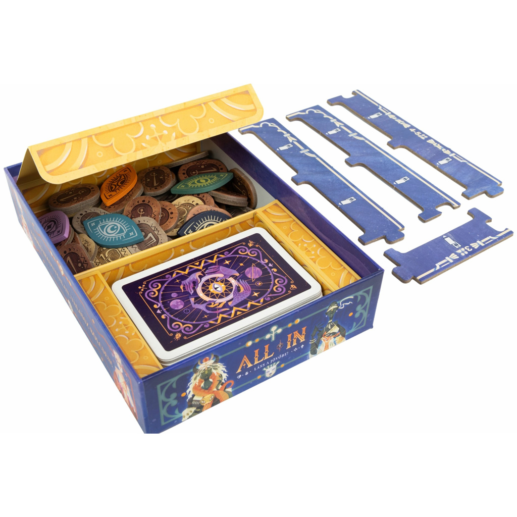 Společenská hra All In – Podívej se do budoucnosti! je vzrušující a neobyčejná karetní hra, ve které se spolu se svým dítětem můžete pokusit prokouknout tahy soupeřů a myslet dopředu. Působivé, mystické ilustrace vás okamžitě vtáhnou, zatímco hra neustále klade na hráče rozhodnutí. Cílem je co nejlépe hospodařit se svými kartami a žetony a ve správný okamžik říct „all in“.