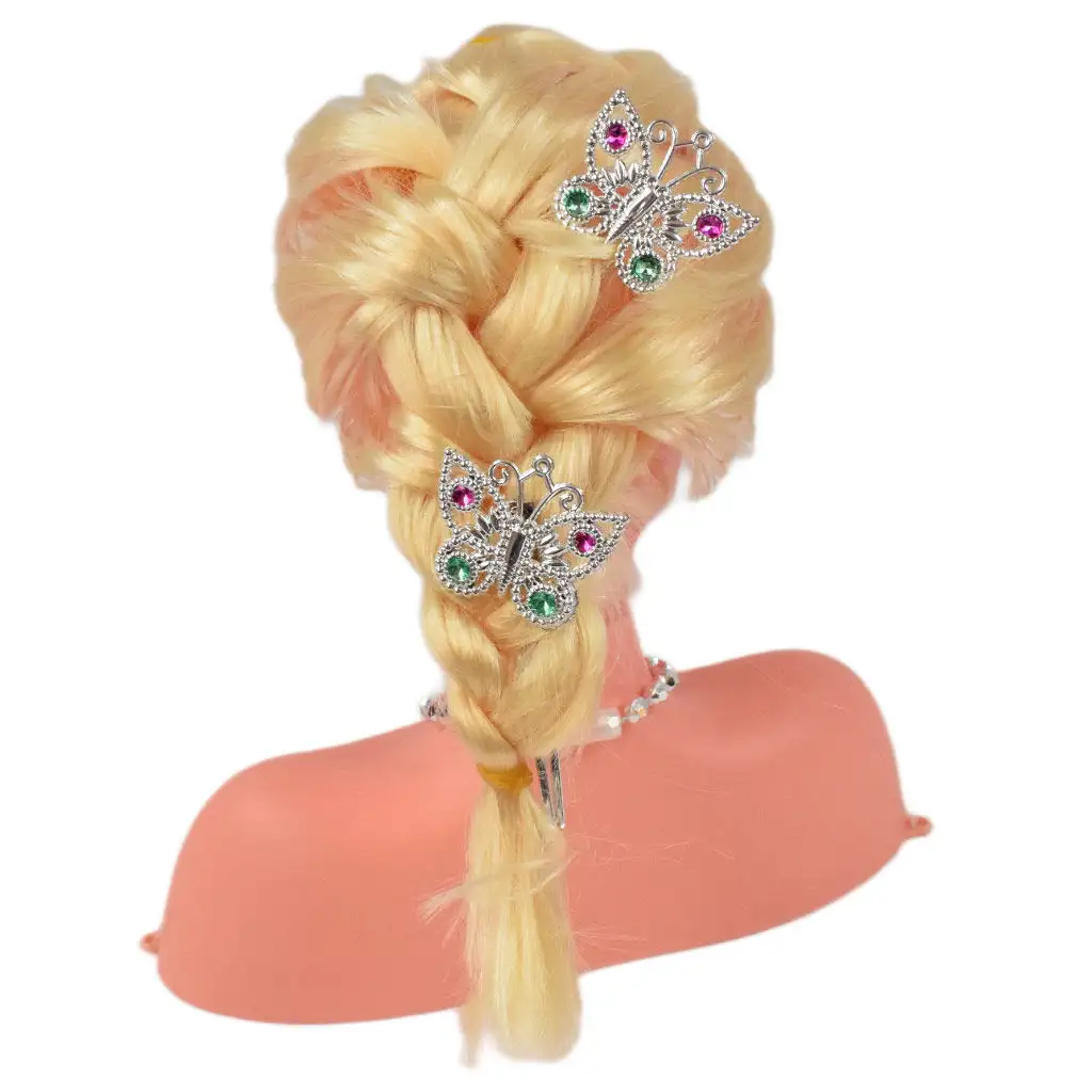 Objevte kouzelný svět s česatelnou panenkovou hlavou! Tato kouzelná, 21 cm vysoká panenková hlava je sen každé malé dívky, která chce vyjádřit svou kreativitu a styl v oblasti úpravy vlasů. Panenková hlava má blond vlasy, které umožňují vytváření a přetváření různých účesů. Balení obsahuje krásnou tiáru, kterou může panenková hlava nosit, a další tiáru, kterou mohou nosit samotné dívky, aby se staly opravdovými princeznami. Hračka obsahuje kadeřnické doplňky, jako jsou šampon, lak na vlasy, hřeben a zrcátko, které umožňují kreativní hru a pomáhají malým dětem naučit se základy úpravy vlasů. Panenková hlava má také dva kusy třpytivých motýlkových spon do vlasů, které dělají účesy ještě krásnějšími. Náhrdelník se srdíčkem na krku dodává panence jedinečný styl. Nejlepší na tom všem je, že vlasy jsou snadno rozčesatelné a zaplétatelné. Malé dívky mohou volně experimentovat s různými účesy a vytvářet vlastní módní trendy. Vlasy jsou hladké na dotek a snadno se s nimi manipuluje, takže panenková hlava je vždy připravena na vytváření nových účesů.