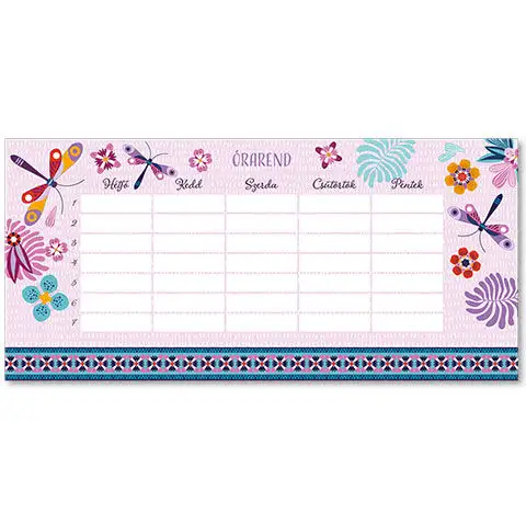 S tímto skvělým rozvrhem vždy přesně budeš vědět, na kterou hodinu jít a také, které domácí úkoly musí být připraveny na další den. Rozvrh zdobený květy a vážkami je oboustranný, takže na něm můžeš označit týden A i B. Rozvrh je v maďarštině, vyroben z 250g pololesklého křídového papíru, který má nádherné barvy a můžeš na něj psát jak perem, tak tužkou. Rozvrh se vejde do většiny penálů, aby byl vždy po ruce a na očích.