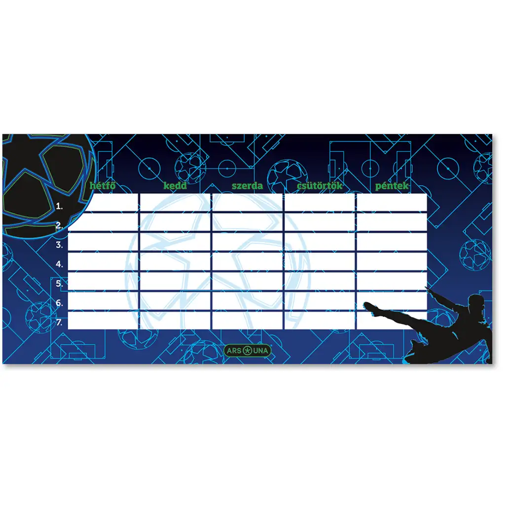 Překvap své fotbalově nadšené dítě opravdu stylovým a praktickým školním doplňkem! Jednostránkový, oboustranný rozvrh hodin Ars Una Champs je perfektní volbou pro kluky i holky, kteří rádi žijí a dýchají ve fotbalovém rytmu. Tmavě modrý podklad a fotbalové hřiště s míčem doplňuje silueta hráče provádějícího efektní nůžky, což celému vzhledu dodává ještě více energie – už jen pohled na rozvrh je vzrušující. Druhá strana se stylově nese v tématickém duchu, takže ji můžeš otáčet podle nálady třeba každý týden.
