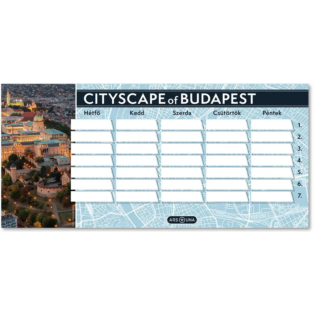 Pokud vaše dítě miluje pohled na Budapešť nebo prostě jen upřednostňuje moderní a čistý design, pak je rozvrh hodin Ars Una Cityscape of Budapest na jeden list a z obou stran tou nejlepší volbou pro každodenní použití ve škole. Na levé straně se objevuje působivá večerní panorama města s Budínským hradním okrskem, zatímco v pozadí jemně vystupují linie mapy, které dodávají elegantní, ale zároveň dynamickou atmosféru.