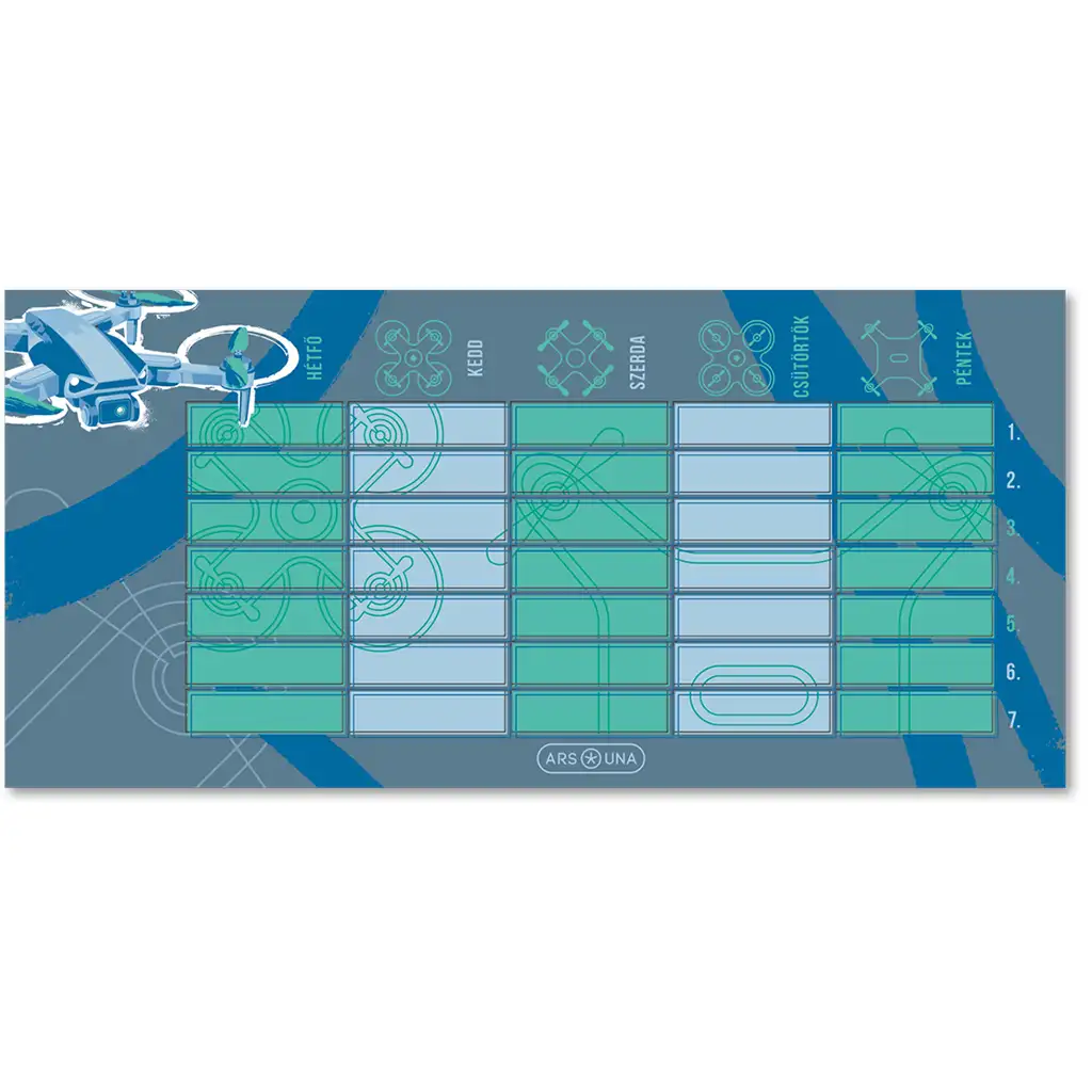 Pokud tvé dítě miluje techniku, gadgety a svět létání, zamiluje si rozvrh Drone Pro! Tento stylový rozvrh s motivem dronu je určený pro kluky (ale i pro drsné holky), které zajímá moderní technologie. Chladné modré a zelené odstíny spolu s futuristickou grafikou dělají rozvrh výjimečným a zároveň usnadňují organizaci školního týdne.