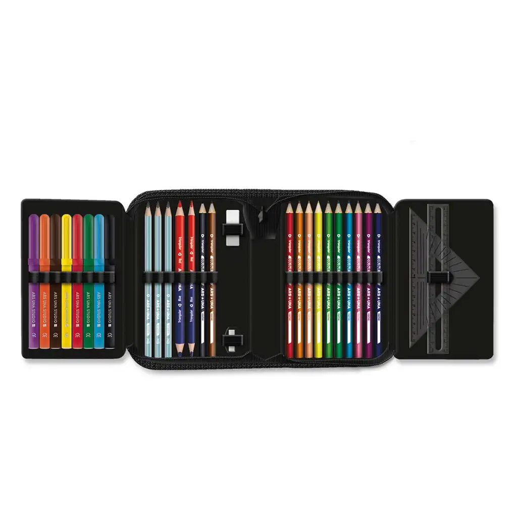 Praktické vnitřní uspořádání pouzdra zajišťuje nejen atraktivní vzhled, ale také obsahuje všechny potřebné pomůcky. Kromě 12 barevných pastelek, 3 grafitových tužek, fixů, gumy, ořezávátka a dvou pravítek mohou žáci organizovat svůj rozvrh pomocí přehledného týdenního rozpisu (A-B týden). Pouzdro se zavírá odolným zipem a snadno se vejde do každé školní tašky.