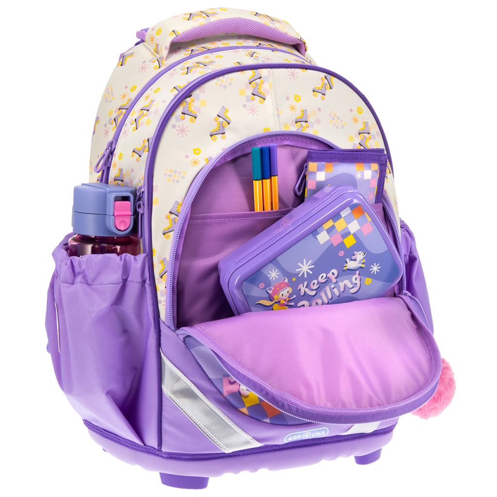 Anatomický školní batoh Ars Una Keep Rolling je perfektní volbou, pokud hledáte veselou, přitom praktickou tašku pro své dítě do začátku školy. Batoh zdobený motivem na kolečkových bruslích a v pastelově fialových barvách není jen stylový, ale byl navržen speciálně pro potřeby mladších školáků. Doporučujeme pro žáky 1.–4. třídy, takže je ideálním společníkem pro každodenní učení.