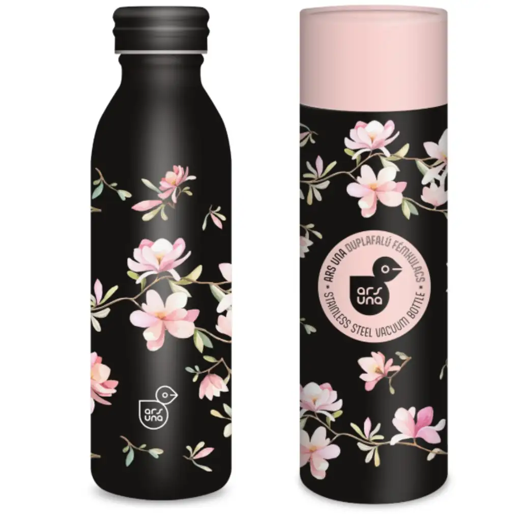 Láhev Ars Una s motivem květů magnólie a dvojitou stěnou je elegantním doplňkem pro každodenní použití. Vyrobena je z prvotřídní nerezové oceli 304SS, černý podklad zdobí jemný pastelový květinový vzor, díky čemuž je nejen praktická, ale i stylová. Láhev o objemu 600 ml má mezi dvěma 0,4mm stěnami 3mm vakuovou izolaci, která udrží nápoj v létě až 24 hodin studený a v zimě až 12 hodin teplý.
