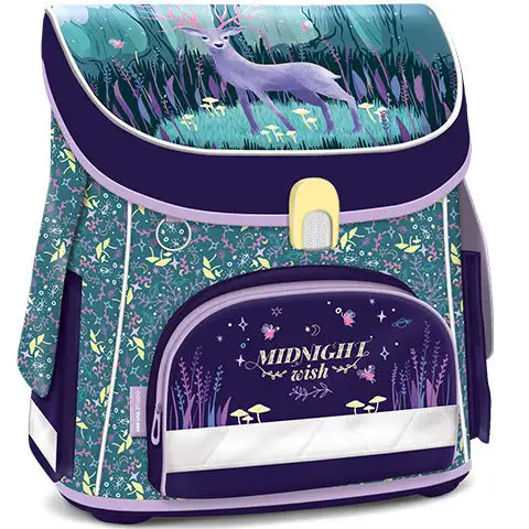 Pokud hledáte pro svou dceru opravdu dívčí, ale přesto originální školní tašku, se kterou může začít školní rok, Midnight Wish je skvělou volbou, protože s jejími dívčími barvami a roztomilým vzorem si okamžitě získá srdce malých dívek a budou se těšit, až do ní připraví školní potřeby. Taška má na zádech ergonomický design šetrný k páteři, který je kombinován s tuhým a polstrovaným provedením. Ramenní popruhy jsou nastavitelné v několika bodech a jsou široké pro pohodlí, zatímco spodní část tašky je vyrobena z odolného tvrdého plastu. Uvnitř má textilní dělicí prvek, do dvou velkých přihrádek mohou děti ukládat své věci. Na vrchu tašky uvnitř je průhledný plastový kapsář a rozvrh hodin. Po stranách má dva kapsy uzavíratelné na suchý zip, jejichž dno je nastavitelné velikosti také na suchý zip.
