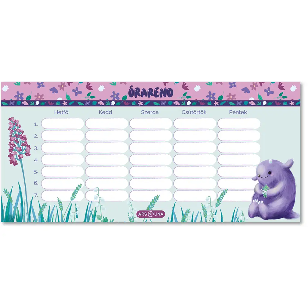 Okořeňte vyučovací týden s rozvrhem Ars Una Mon Mignon, který si zamilujete díky roztomilému fialovému příšerákovi! Okouzlující grafika, pastelové barvy a veselé květinové vzory jsou ideální pro děti, které mají rády roztomilou, snovou atmosféru a rády by si tímto rozvrhem vyzdobily svůj pokoj nebo školní výbavu.