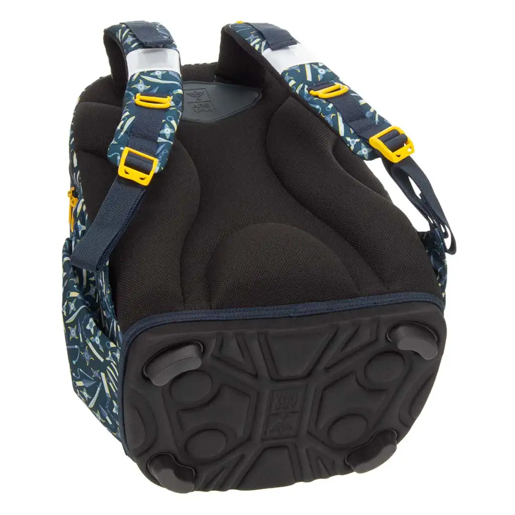 Batoh váží pouze 0,9 kg, takže je vhodný pro děti a snadno se nosí. Tři prostorné přihrádky na zip pomáhají s organizací věcí: největší z nich má textilní přepážku, v nejmenší nechybí našitý držák na psací potřeby a kapsa na průkazky. Po obou stranách jsou pružné kapsy vhodné na láhev nebo drobnosti. Spodní část je z odolné textilie, kterou chrání 4 plastové nožky před poškozením, reflexní prvky pak zvyšují bezpečnost ve tmě.
