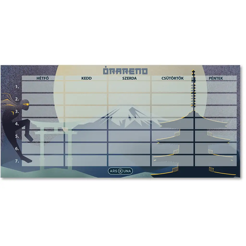 Rozvrh hodin Ars Una Ninjas in the Dark je určen pro fanoušky japonských bojových umění a tajemného světa, a přináší do školních všedních dnů jedinečnou atmosféru. V pozadí se nad horami tyčí obrovský úplněk, vlevo ve stínu hlídá ninja tradiční torii bránu, zatímco napravo kouzelná pagoda dotváří orientální náladu.