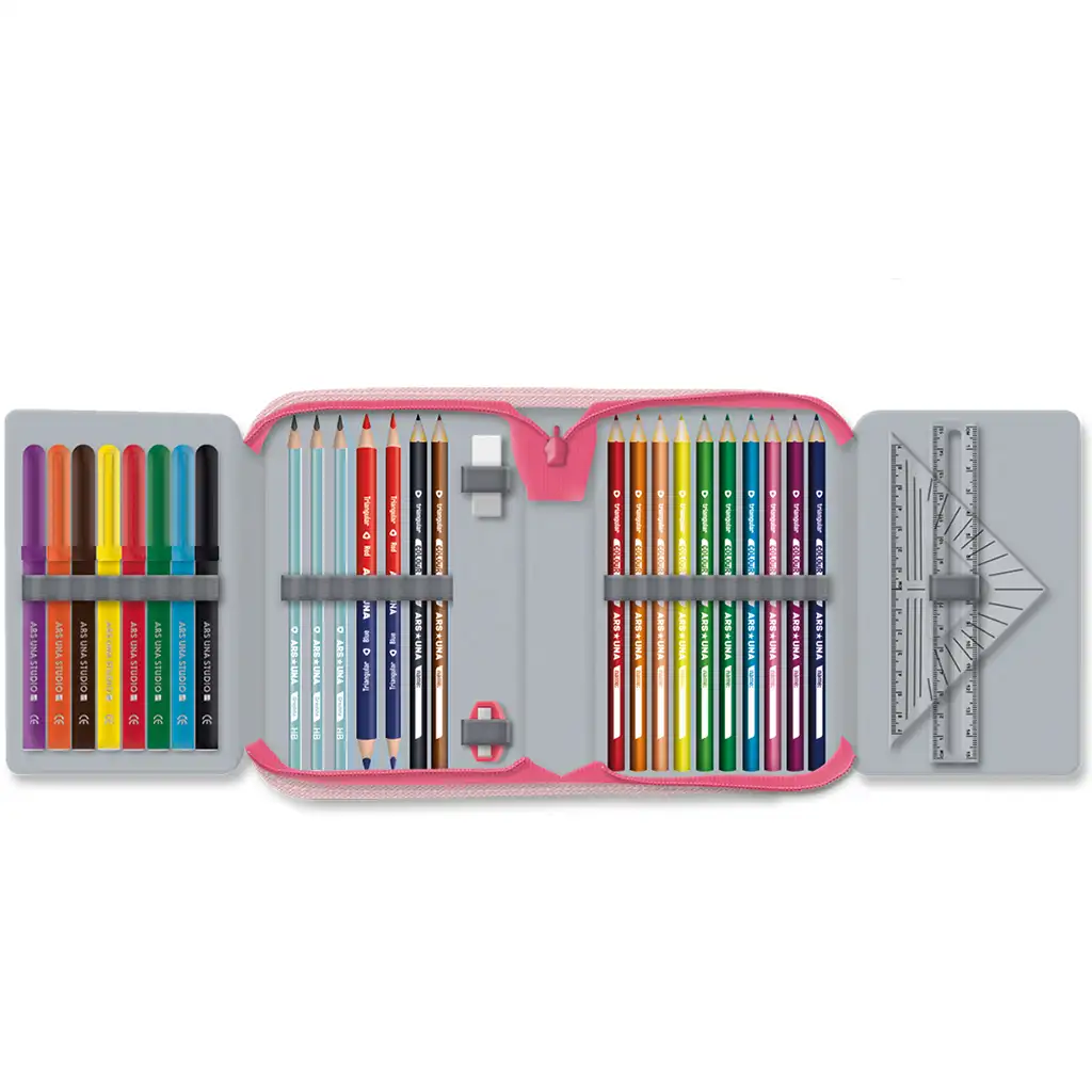 Uvnitř rozkládacího pouzdra najdeš všechny potřebné psací potřeby, které se ti ve škole mohou hodit: 12 trojhranných barevných tužek, 3 grafitové tužky HB, 2 poštovní tužky, 8 jasně barevných fixů a také gumu a ořezávátko. Dále dvě pravítka (jedno rovné o délce 17 cm a jedno trojúhelníkové) a rozvrh hodin na týden A-B pomáhají s organizovaným učením.
