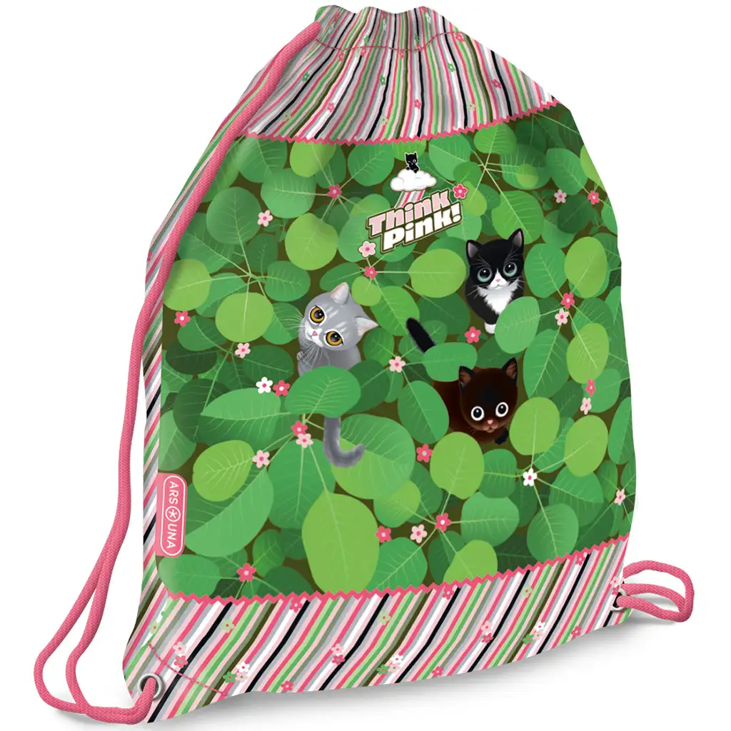 Taška na tělocvik Think Pink s kočičkami bude oblíbená u každé holčičky, která miluje zvířata! Tři roztomilé kočky vykukující z veselého, zeleného listí vykouzlí úsměv na tváři každému dítěti, zatímco hravé barevné provedení – růžové proužky a květinová ozdoba – dělají vzhled tašky ještě výjimečnějším. Tento sportovní vak je nejen roztomilý, ale také velmi praktický.