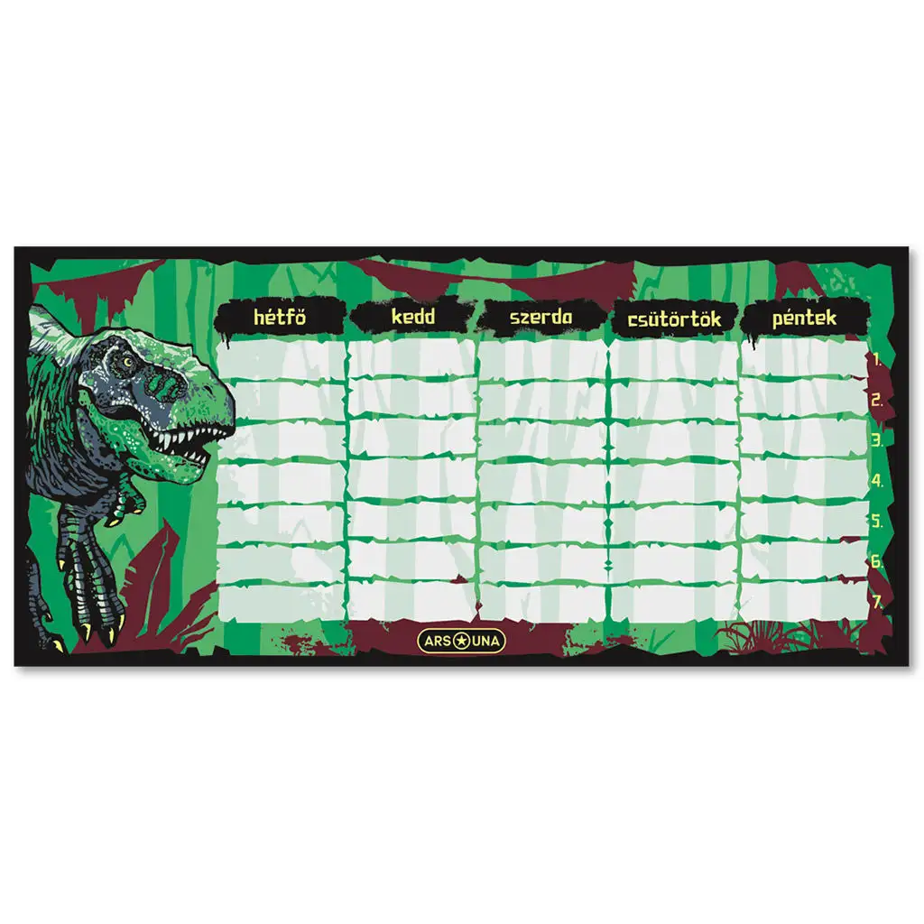 Poznejte rozvrh hodin Ars Una T-Rex, který je vzrušujícím a stylovým doplňkem pro každého fanouška dinosaurů. Tento rozvrh hodin je zdoben motivem T-rexe na zeleném pozadí, obklopen černým rámečkem, takže je nejen praktický, ale také jedinečný a inspirativní, což každý váš den udělá zajímavějším.