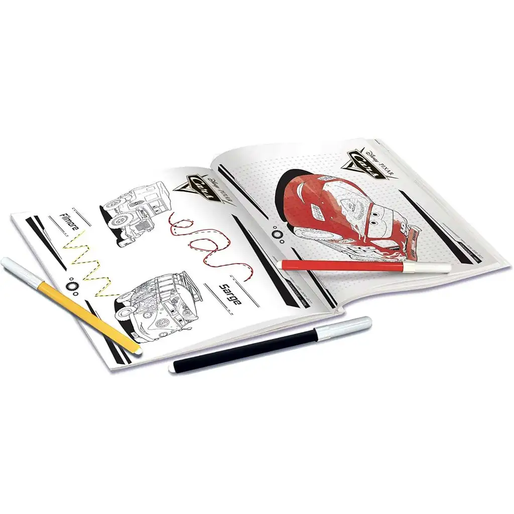 Sada obsahuje čtyři znovupoužitelné tabulky s různými vzory (mřížkovaná, linkovaná, prázdná a tečkovaná), jejichž okraje zdobí postavičky z filmu Auta. Součástí balení je také zábavný pracovní sešit s omalovánkami, šablonami a kreslícími návody, díky nimž se děti naučí krok za krokem kreslit auta. Tři barevné fixy, jedna mazací fixa a houbička umožňují všestranné použití a všechny součásti se snadno vejdou do krabice, takže je můžete mít vždy po ruce.