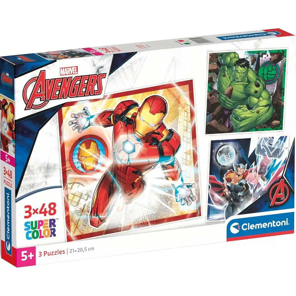 Spoj sílu a strategii s 3x48 dílkovou Supercolor puzzle sadou od Clementoni s Avengers. Připoj se k Iron Manovi, Hulkovi a Thorovi na epickém dobrodružství, které s každým položeným dílkem více odhaluje vesmír Marvelu. Tyto puzzle zobrazují tvé oblíbené hrdiny v akci, vyvolávají vzrušení z proslulých komiksů a filmů.