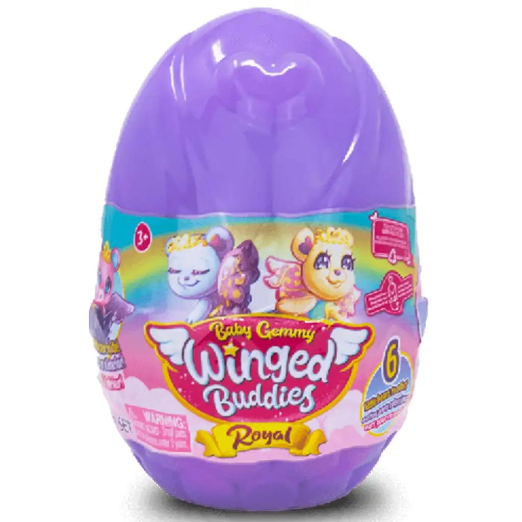 Baby Gemmy: Královské překvapení plyšový medvídek přináší skutečnou magii do dětského pokoje! Skrývá se v nádherném fialovém vejci, čekající na objevení. Okamžik rozbalení je zaručeně vzrušující, protože nikdy nevíte, který speciální okřídlený medvídek se skrývá uvnitř. Každý Baby Gemmy plyšový medvídek přichází s královskou korunou a zářivými, třpytivými křídly, takže se stává skutečným princeznovským nebo princovským doplňkem dětského herního království.