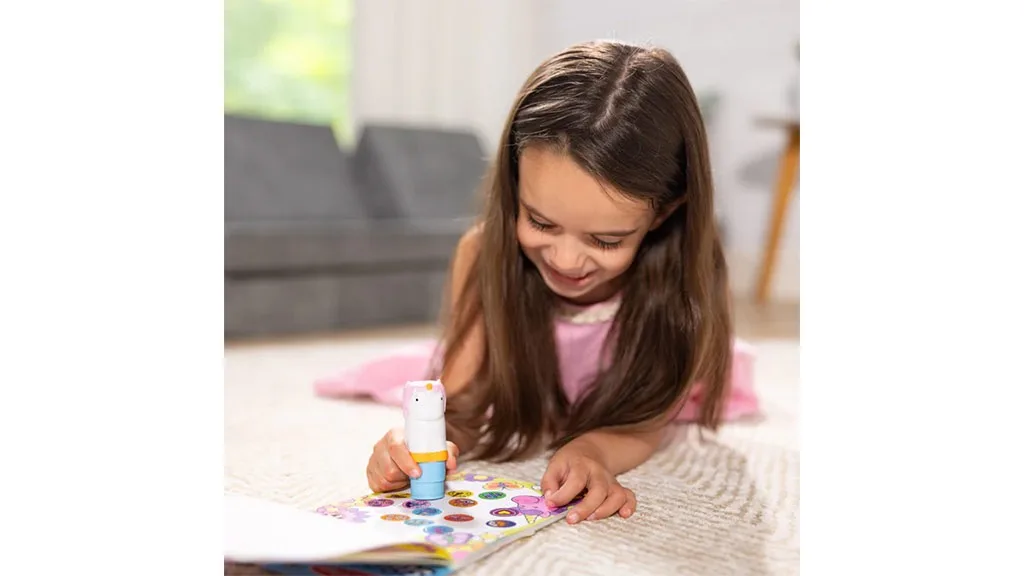 Samolepicí razítko navržené pro děti od 3 let a starší je snadno použitelné pro malé ruce s 300 předem načtenými samolepkami, které nemají zadní stranu, kterou by bylo třeba sloupnout. Samolepky jsou snadno odstranitelné, takže rodiče nemusí mít obavy, že by samolepky skončily na nechtěných místech.