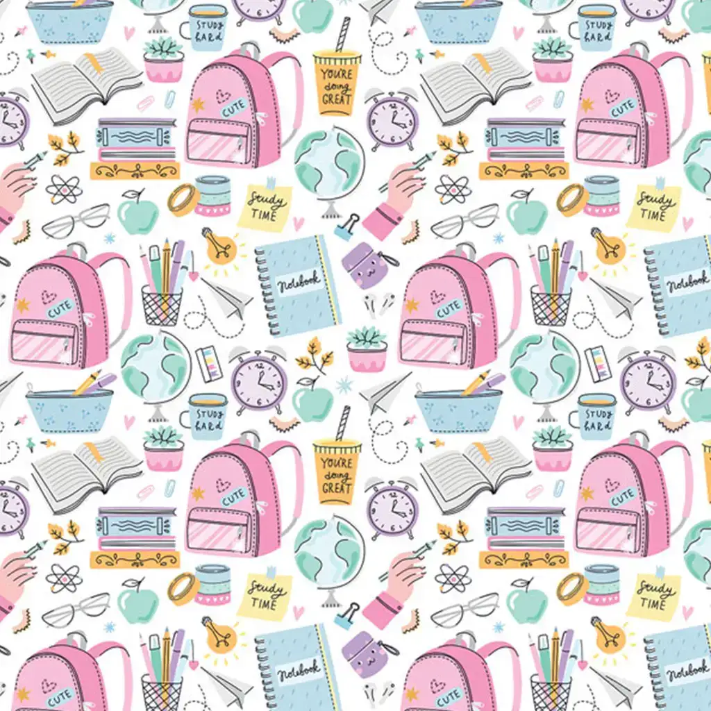Tento veselý a inspirativní balicí papír je dokonalou volbou pro každé školou povinné dítě! Papír o rozměrech 100 x 70 cm je plný roztomilých, ke studiu motivujících vzorů, které vykouzlí úsměv na tváři malých i větších školáků. Růžové batohy, sešity, tužky, glóbusy, hodiny a motivační nápisy – například „Study Time“ a „Youre Doing Great“ – všechny povzbuzují děti, aby se s nadšením pustily do učení.