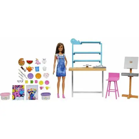 Dívky se mohou připojit k panence Barbie pomocí sady hraček Ateliér pro relaxaci a podílet se na kreativních procesech! Děti se mohou naučit soustředění a relaxaci vytvářením keramiky a malováním! Začněte tím, že vyndáte Barbie těsto z nádoby a srolujete ho do koule. Umístěte těsto do formy na vázu. Stiskněte a odhalte nové dílo! Postavte vázu na otáčecí talíř a vyberte si vzor. Otočte stůl, abyste vytvořili otisk na těstě, a až bude hotový, hrdě umístěte dílo na polici. Namáčejte štětec se houbou do studené vody a malujte bílé kusy, aby se odhalilo mistrovské dílo: na zádech prasátka jsou modré tečky, na srdcovém talíři jsou růžová srdce a medvěd má fialové oči. Postavte je na polici a obdivujte díla! Děti mohou hrát a tvořit s touto skvělou sadou znovu a znovu! Barbie může také předstírat, že maluje na svém malířském stojanu, ze kterého si může vybrat mezi dvěma barevnými plátny. Sada hraček obsahuje panenku Barbie s ohebnými koleny a více než 25 různých doplňků.
