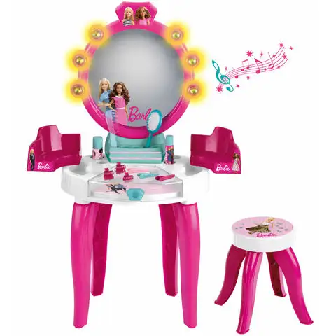 Malé holčičky si zamilují tento úžasný kadeřnický salón, protože v něm najdou místo pro každý malý doplněk. Toaletní stolek s mnoha doplňky může patřit malým dětem, stejně jako židle s Barbie dekorací podobná stolu, na kterou si mohou okamžitě sednout. K dispozici jsou také malé úložné boxy pro umístění doplňků, velké zrcadlo je obklopeno lampami. Kromě světel zvukové efekty dělají líčení a česání vzrušující.
