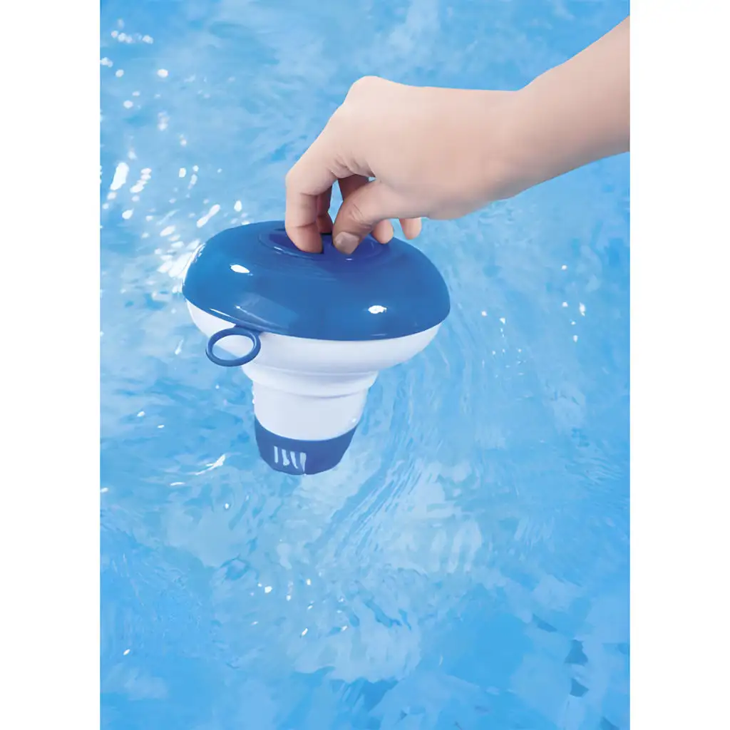 Sbalitelná konstrukce dávkovače umožňuje snadné umístění do vody v bazénu a zajišťuje stabilní a efektivní fungování. Stačí umístit dávkovač do vody a nechat ho pracovat na udržení čistoty vody.