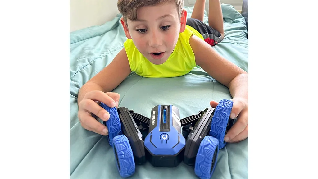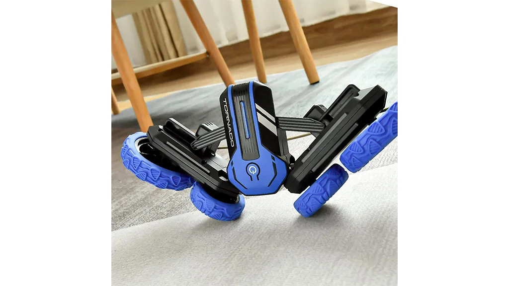RC Stunt Car, které je určeno pro děti od 6 let a starší, je navrženo pro akci. Kola vozidla jsou velká, takže může jezdit i když je obrácené vzhůru nohama. Navíc má speciální zadní nápravu, která roztáhne kola, což je ideální pro otáčení. Na dálkovém ovladači je také další tlačítko, které aktivuje režim Tornádo, kde se RC Stunt Car otáčí na předních kolech, zatímco zadní kola jsou ve vzduchu. K dispozici jsou tři různé rychlosti otáčení pro různé úrovně epické zábavy.