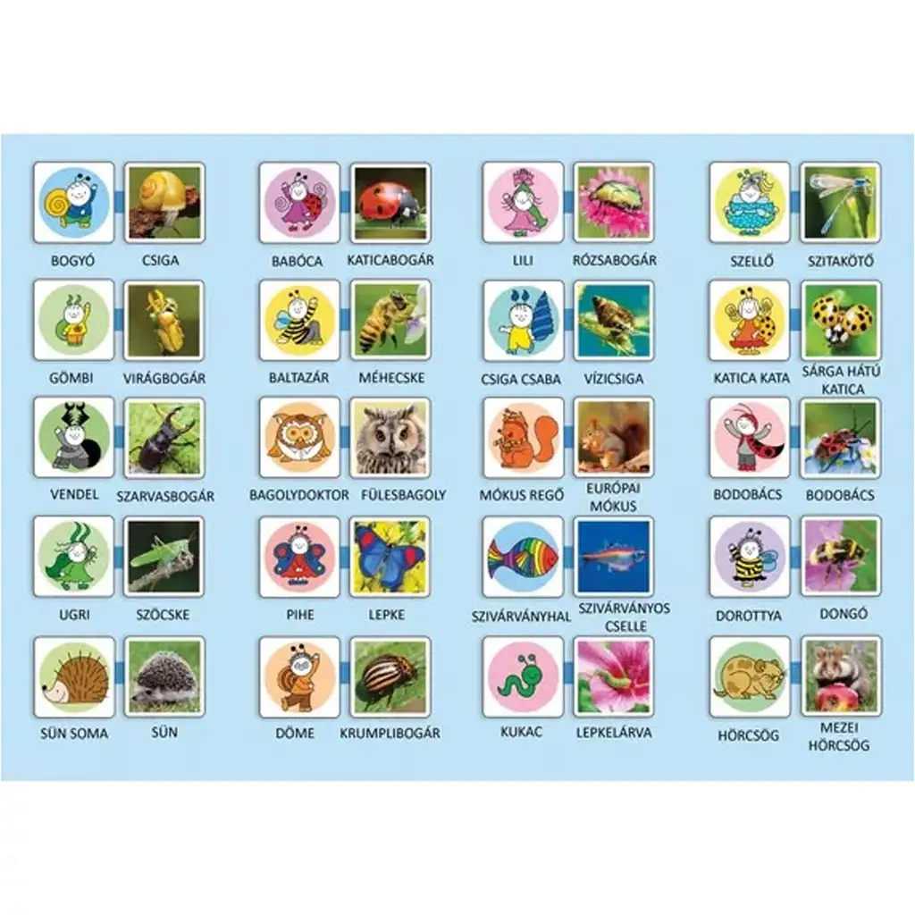 Vývoj a zábava ruku v ruce – poznej svět Bogyó a Babóca s touto veselou paměťovou hrou! Paměťová hra Kdo je kdo? není jen skvělou zábavou pro nejmenší, ale také pomáhá rozvíjet pozorovací schopnosti, koncentraci a paměť. Oblíbené postavičky – Bogyó, Babóca, Baltazár, Pihe a ostatní – se nyní párují se skutečnými zvířaty, takže během hraní dochází i k učení: ke komu patří beruška, včelka, šnek nebo sova?