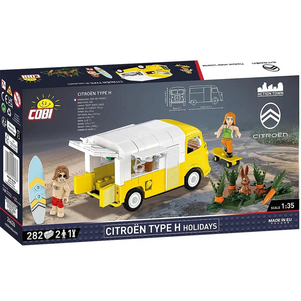 Tato stylová stavebnice COBI ti umožní postavit legendární Citroën Type H (1947–1981), který byl přeměněn na veselý, pojízdný zmrzlinový bar. Sada vkusně reprodukuje charakteristickou vlnitou plechovou karoserii a obsahuje také malou diorámu: mýtinu s mrkví, dvojici turistů se surfovým prknem a skateboardem a roztomilého králíčka, který scénu oživuje. Model obsahuje celkem 282 stavebních dílků a 3 figurky, díky nimž si můžeš vytvořit svůj vlastní kreativní prázdninový příběh, ať už formou stavebnice nebo jako dekoraci.