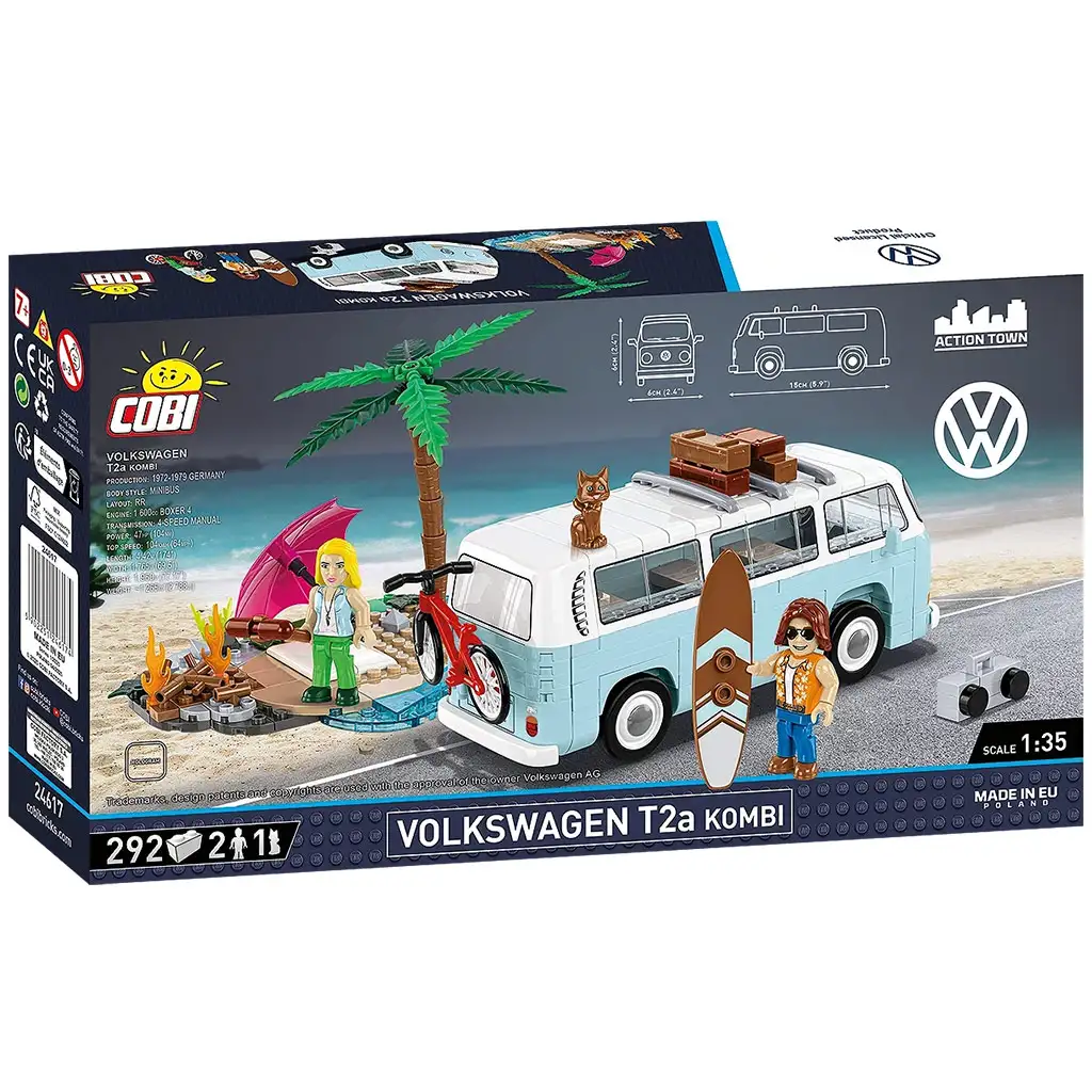 Stavebnice COBI Volkswagen T2a Kombi oživuje legendární autobus „Bulli“ ve variantě Kombi v podobě kostek. Model v měřítku 1:35 se skládá z 292 stavebních dílků a přesně vystihuje tvary a charakter originálního vozidla. Mezi doplňky patří miniaturní plážová dioráma: písek, palma, táborový oheň, opékač se slaninou, slunečník, ručník, surfařské prkno, kufr, retro stereo magnetofon a roztomilá kočička – vše navozuje atmosféru skutečného letního dobrodružství.