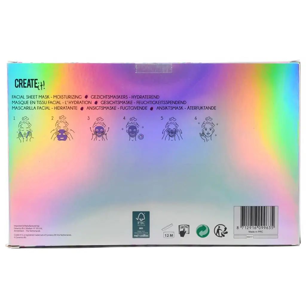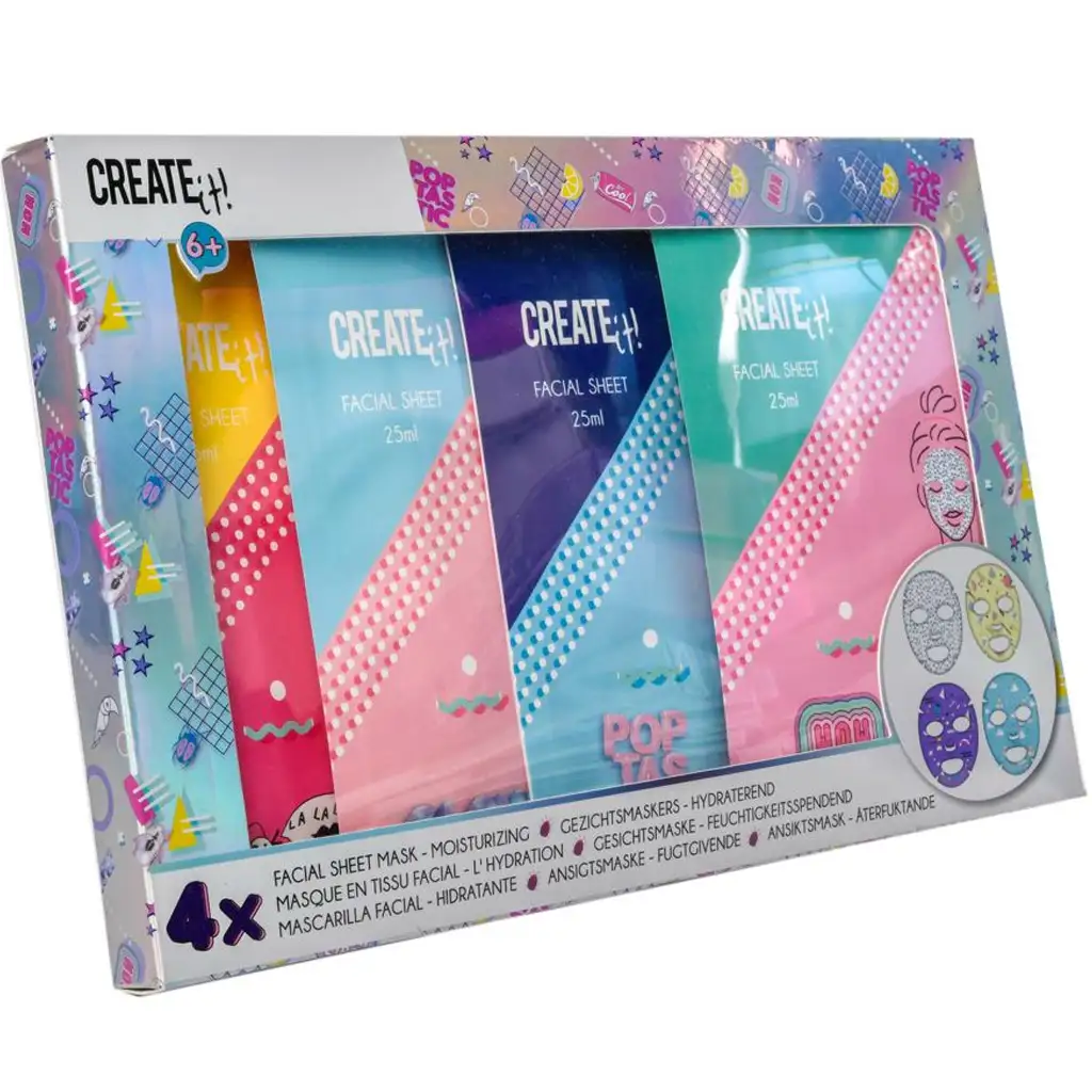 Sada hydratačních pleťových masek Create It! nabízí skutečný wellness zážitek již od 6 let, v hravé, barevné a stylové formě! Tento speciální balíček péče o krásu obsahuje čtyři textilní masky ve tvaru obličeje, které nejen zjemňují a hydratují pokožku, ale zároveň poskytují skvělou zábavu malým milovníkům krásy.