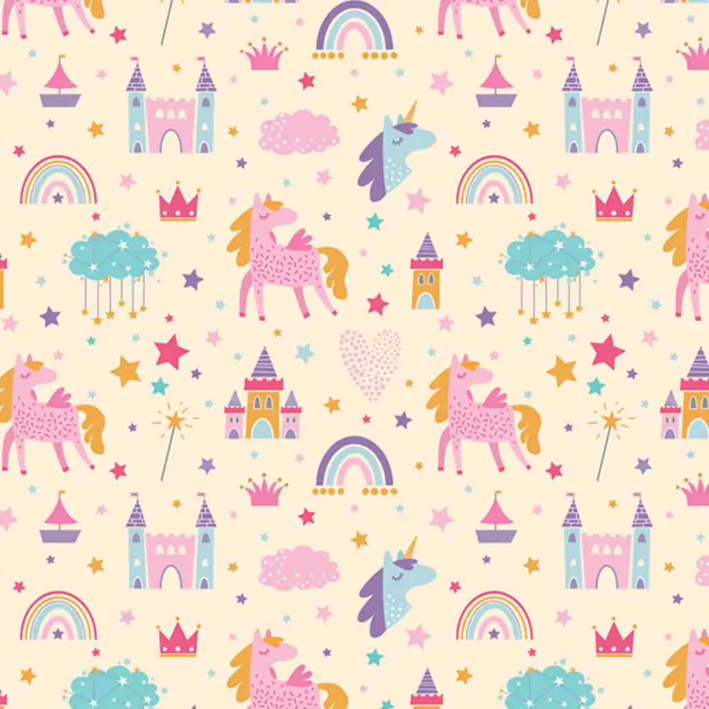 Okouzlete malé holčičky ještě před rozbalením dárku tímto kouzelným balicím papírem s motivem jednorožců o rozměrech 100x70 cm! Roztomilý design ovládají růžové, fialové a pastelové odstíny, přičemž povrch zdobí usměvaví jednorožci, princeznovské zámky, duhy, kouzelné hůlky, obláčky, korunky a hvězdičky – jako by se na papíře skutečně odehrával pohádkový příběh.