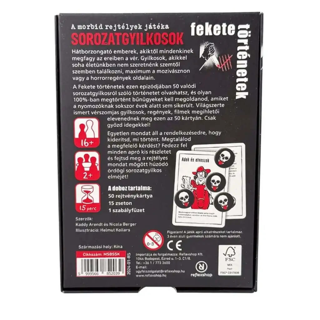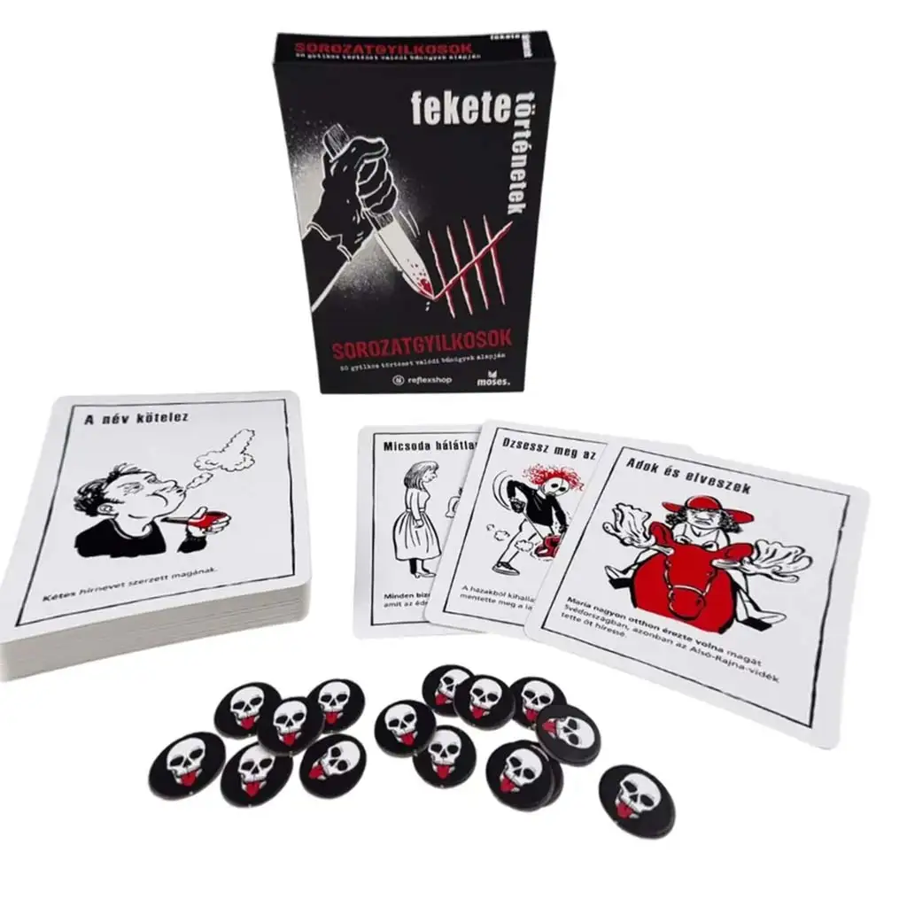 Trocha černého humoru ještě nikdy nikoho nezabila... nebo snad ano? Hra s logickými příběhy Černé historky: Sérioví vrazi není jen morbidní a mrazivá, ale zároveň natolik zábavná, že zaručeně oživí každé přátelské setkání. V tomto speciálním vydání najdete 50 příběhů inspirovaných skutečnými případy sériových vrahů – a každý z nich začíná tajemstvím, které musíte společně rozluštit.