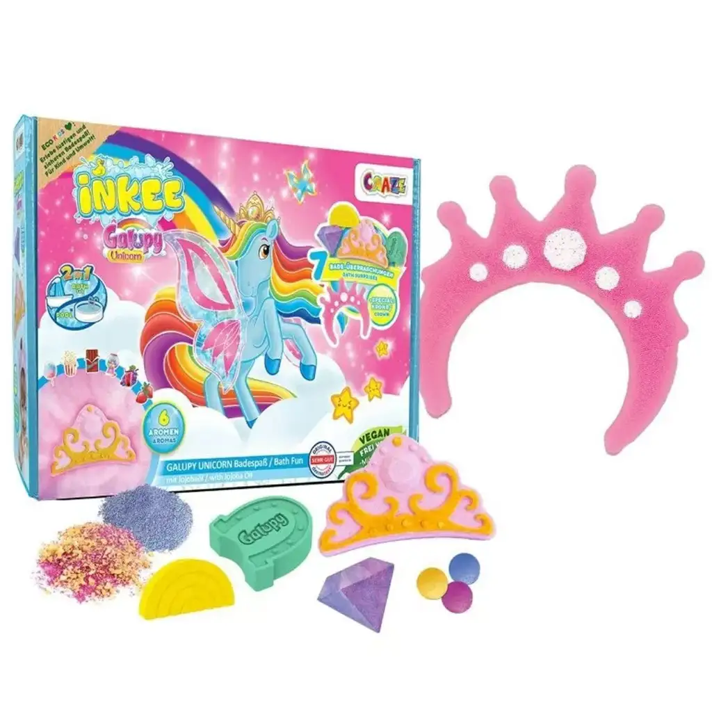 Udělej koupání opravdu kouzelným s velkou koupelovou bombou Craze Inkee Galupy Unicorn, která je snem každého malého fanouška jednorožců! Tato úchvatná, barevná sada nenabízí jen obyčejný zážitek z koupele, ale skutečné dobrodružství plné vůní, překvapení a kreativní zábavy.