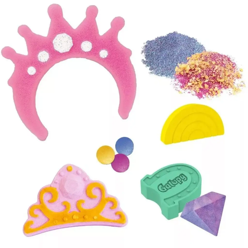 V balení najdete 7 různých koupelových překvapení, včetně koupelové bomby s vůní cukrovinek, praskající koupelové soli s jahodovou příchutí, ovocných koupelových perel, duhové koupelové placky a mnoho dalšího! Každý kousek se svým jedinečným tvarem, barvou a vůní promění večerní koupání v opravdový zážitek. Zvláštností sady je také zlatá korunka, díky které se děti mohou cítit jako skutečné koupelové princezny nebo princové!