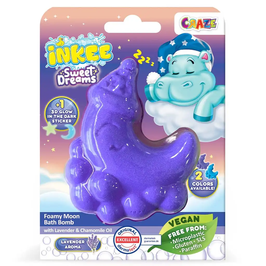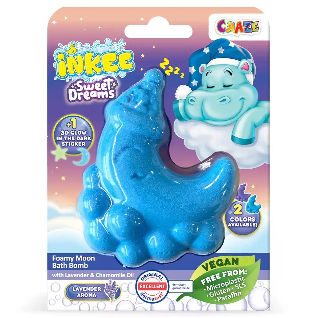 Udělejte večerní koupel dětí uklidňující a kouzelnou s koupelovou bombou Craze Inkee Sladký sen ve tvaru měsíce! Tato speciální koupelová bomba ve tvaru měsíce s jemnou vůní levandule a heřmánku pomáhá dětem uvolnit se a připravit se na klidnou noc. Bomba se šumivě rozpouští ve vodě, vytváří bohatou pěnu a naplňuje koupelovou vodu snovými barvami – zářící modře nebo fialově.