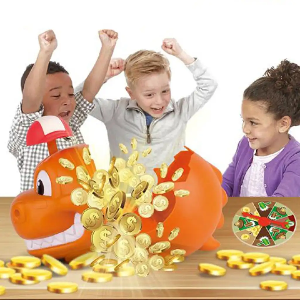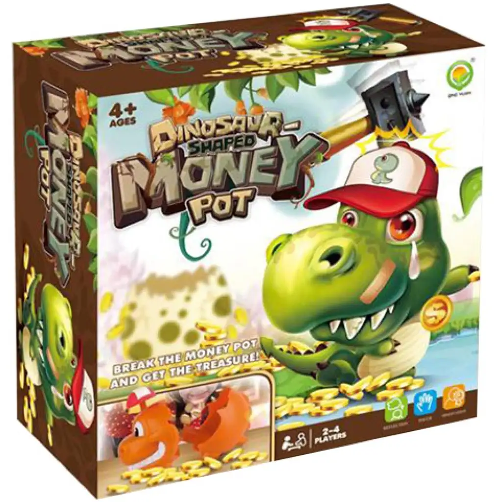 Sbírej peníze do dinosauří pokladničky, rozbij ji a získej všechny zlaté mince! Tato skvělá společenská hra nabízí vzrušující zábavu až pro čtyři hráče a vaše dítě může hrát společně s rodinou nebo přáteli a sbírat zlaté mince. Průběh hry je velmi jednoduchý, hráči se střídají v točení a musí splnit úkol, který si vytočí. Pro rozbití dinosauří pokladničky je v herní sadě k dispozici plastové kladívko.
