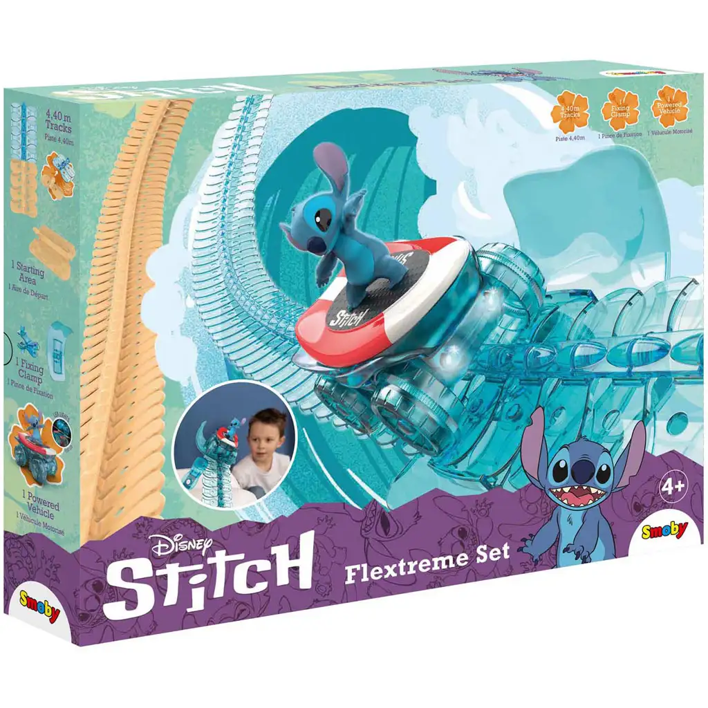 Speciální díly z průhledného plastu vytvářejí celkem 4,4 metru dlouhou flexibilní dráhu, po které jezdí silně motorizované vozidlo se Stitchem na surfu. Vozidlo navíc svítí, což je zejména ve tmě ještě efektnější! Součástí je také fixační pásek a výchozí bod, takže začátek i stabilní uchycení dráhy je hračka.