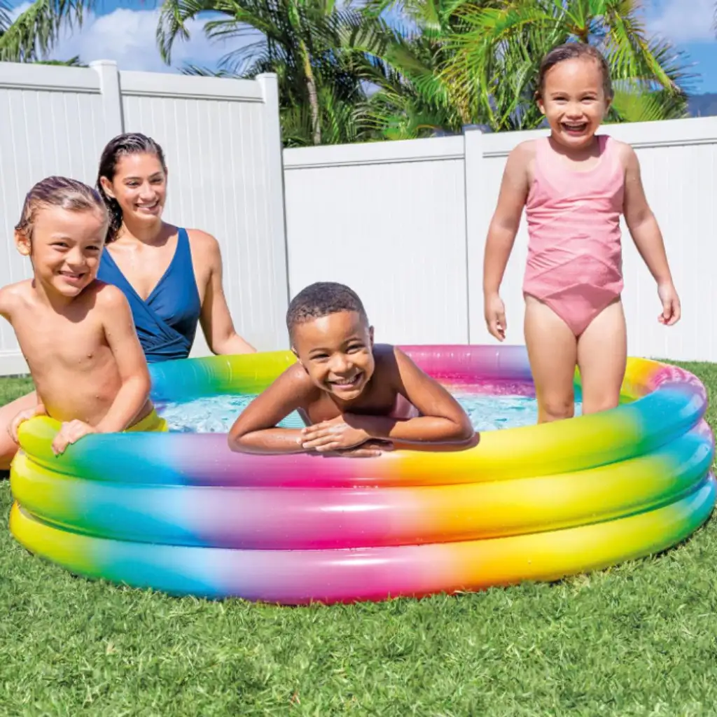 Děti si zamilují tento bazén zdobený veselými barvami, obzvláště v letním horku bude mít velký úspěch chladivá voda bazénu. Bazén vyrobený z pevného odolného materiálu téměř nezabírá místo ve vyfouknutém stavu, ale rychle a snadno se nafoukne a může být postaven kdekoliv se nám líbí. Stěny bazénu tvoří tři samostatně nafukovací kruhy. Kapacita bazénu při osmdesátiprocentním naplnění je 335 litrů vody.