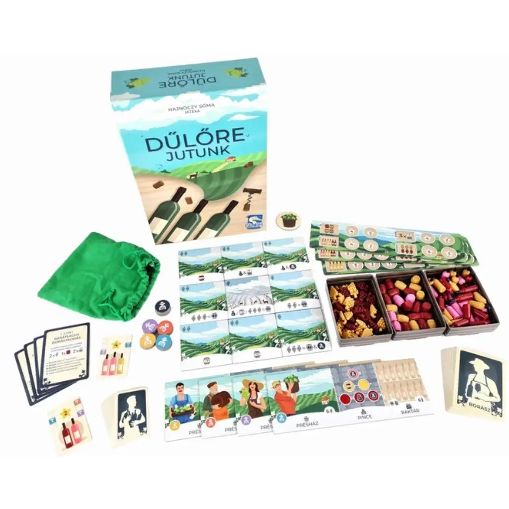 "Důlőre jutunk" je maďarská rodinná desková hra, která nabízí skutečný gurmánský zážitek pro všechny věkové kategorie. Soma Hajnóczy, autor populární hry Fröccs a dvojnásobný mistr světa v kouzlení, nás nyní zavádí do světa vinařství. Cílem hry je vyrobit z hroznů sklizených na vinicích nejchutnější vína, která pak prodáváme na trzích. Pomocí hroznových značek umístěných na destičkách získáváme vítězné body, které můžeme získat prostřednictvím různých vinařských procesů – lisování, zrání, lahvování.