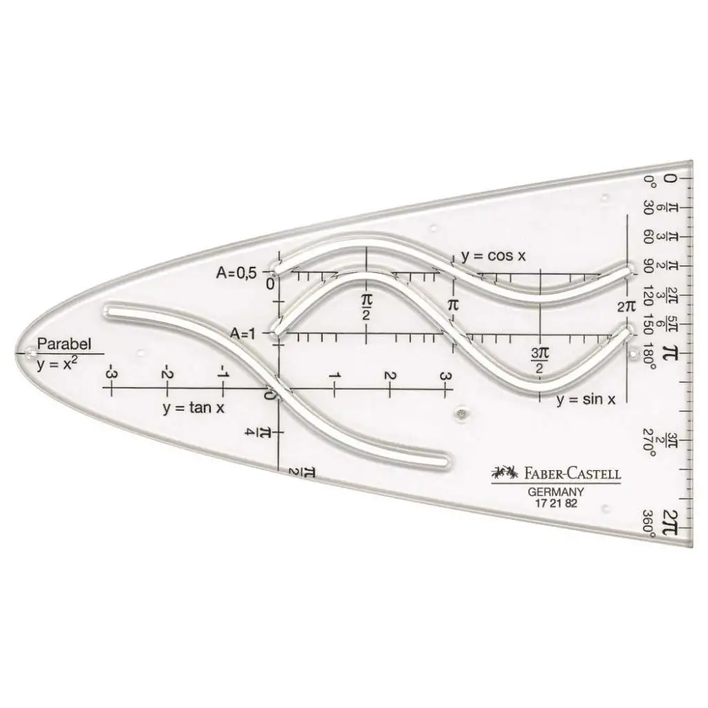 Faber-Castell parabola šablona o délce 14 cm je vynikající pomůckou pro studenty se zájmem o matematiku, zejména pro studenty středních škol a gymnázií, kteří se zabývají znázorňováním funkcí, trigonometrickými křivkami nebo konstrukcemi rovnic. Tato šablona je vhodná nejen pro parabolu (y = x²), ale také pro přesné, pěkné a pravidelné kreslení mnoha dalších důležitých funkcí, jako jsou sinus (y = sin x), kosinus (y = cos x), tangens (y = tan x) a exponenciální tvary.