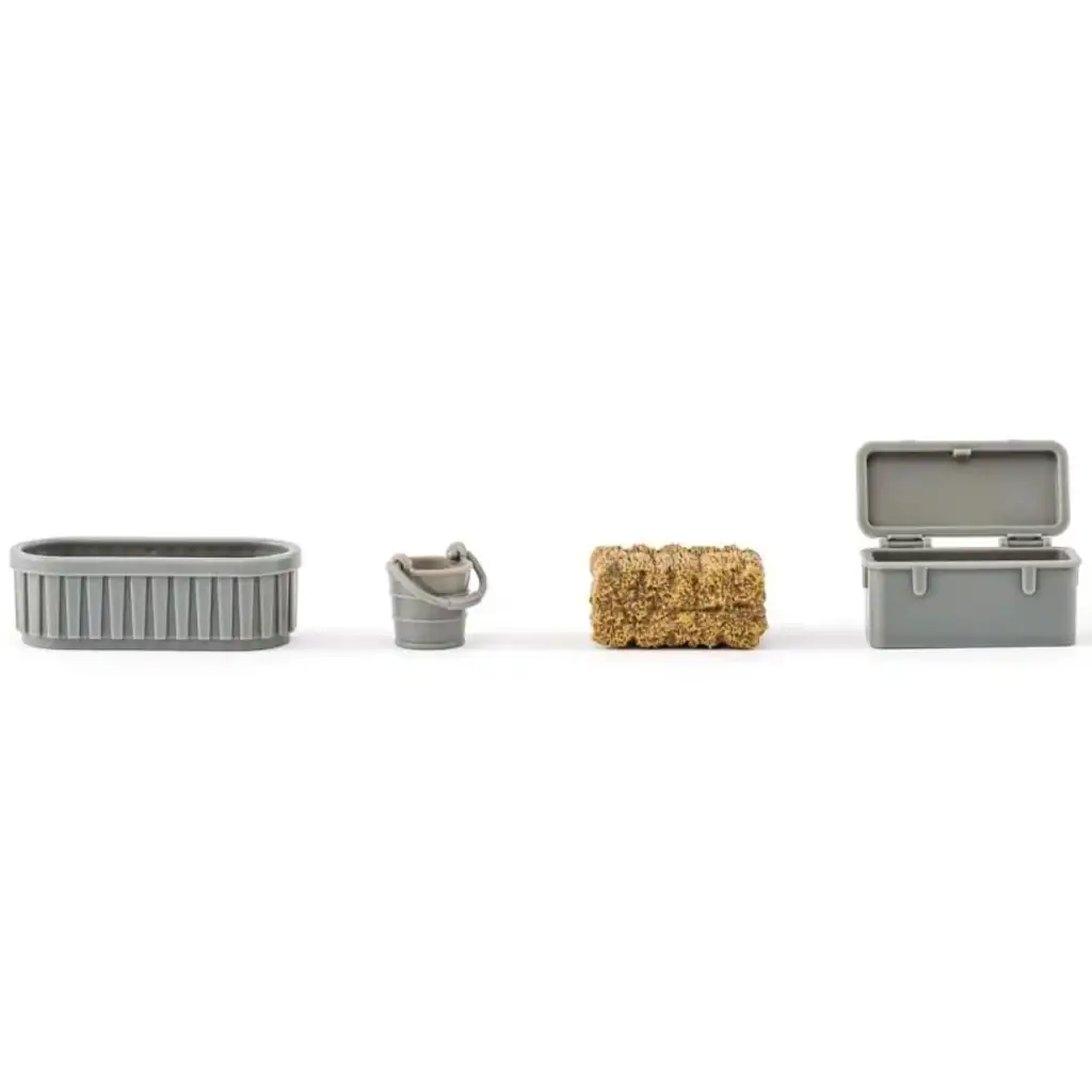 Doplňky činí hru ještě zajímavější: děti zde najdou kolečko, balík sena, kbelíky, hrábě, vidle a další farmářské nástroje, které jim pomohou realisticky přehrávat každodenní úkoly kolem koně. Tyto drobné detaily nejen zvyšují herní zážitek, ale také pomáhají dětem naučit se, jaké úkoly je třeba vykonávat při péči o koně.
