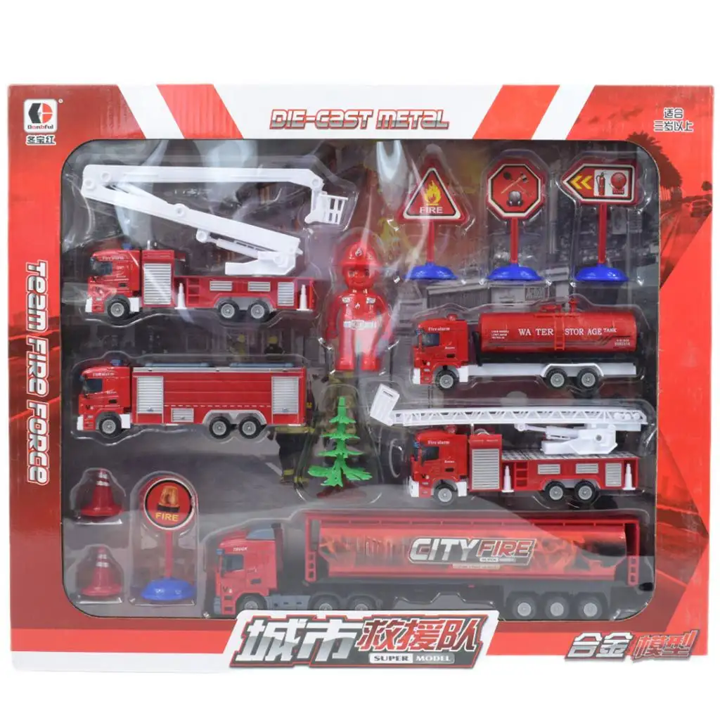 Obsah hasičské hračkářské sady je bohatý a rozmanitý. Sestava obsahuje: jeden nákladní vůz, dva hasičské vozy s žebříkem, jeden cisternový hasičský vůz, jeden hasičský nákladní vůz, dvě závory, čtyři různé značky, jednu figurku a jeden dřevěný prvek. Různá vozidla a mnoho doplňků dávají dětem možnost rozvíjet jejich kreativitu a představivost a inscenovat různé záchranné akce.