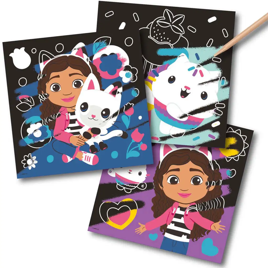 Součástí sady je i škrabací tyčinka, díky které mohou děti bezpečně a snadno odstranit černou vrstvu z listu a odhalit tak barevné ilustrace. Na obrázcích se objeví Gábi, Kočičí muffin, Pandy Paws a další – každé škrábnutí přináší novou radost a překvapení, které zaručeně vykouzlí úsměv na tváři. Škrabací obrázky rozvíjí jemnou motoriku, kreativitu a trpělivost, a díky nim se tvoření stává napínavým objevováním.