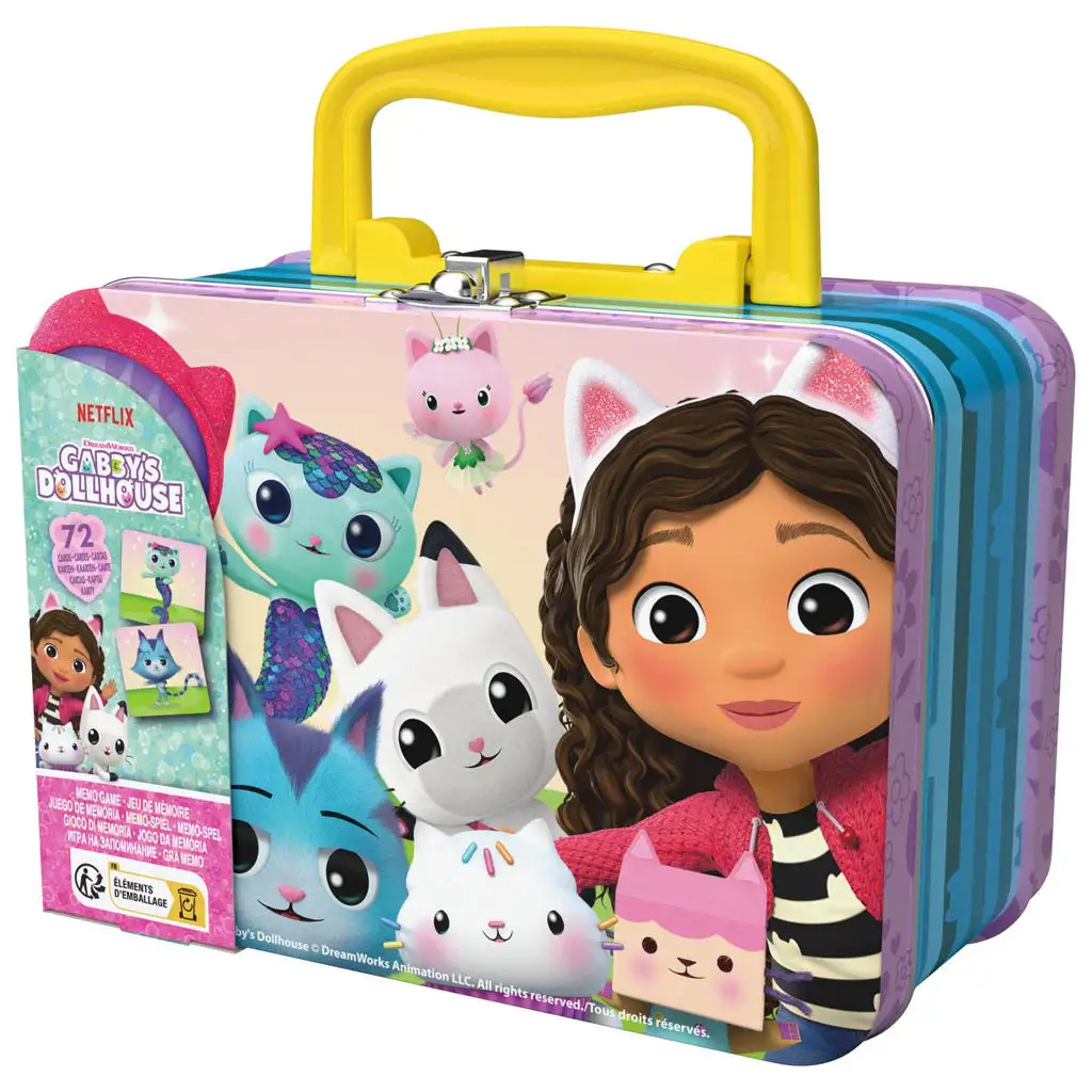 Karty jsou uloženy v praktickém a snadno přenosném kovovém kufříku, jehož uzavírací mechanismus zajišťuje, že hra zůstane vždy v pořádku a bezpečí. Výzdoba kufříku věrně odráží pohádkový svět Gabiina domečku pro panenky, takže děti budou hru rády vytahovat znovu a znovu.