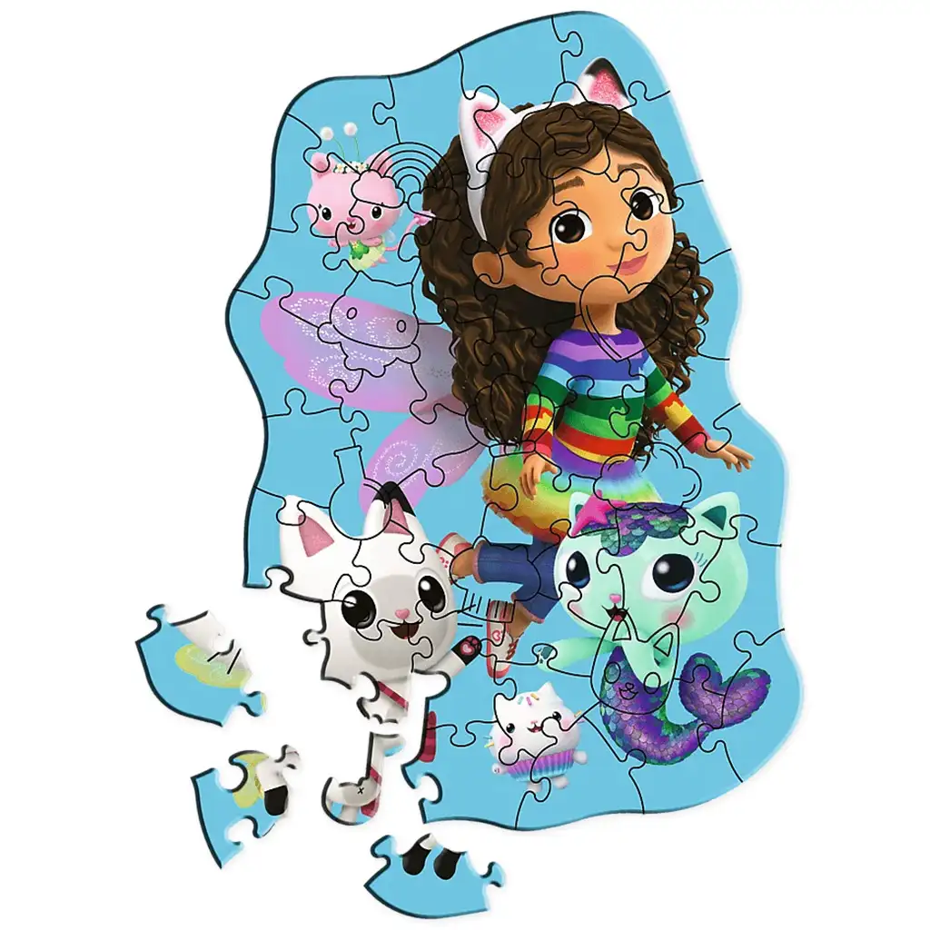 Pokud vaše dítě miluje populární animovaný seriál na Netflixu s názvem Gabiho domeček, tento speciální 50dílný dřevěný puzzle s obrysy mu určitě udělá radost! Puzzle zobrazuje veselou a kouzelnou scénu, kde Gabi a její roztomilí kočičí přátelé – Pandy Paws, DJ Catnip a MerCat – zažívají pohádkové dobrodružství.