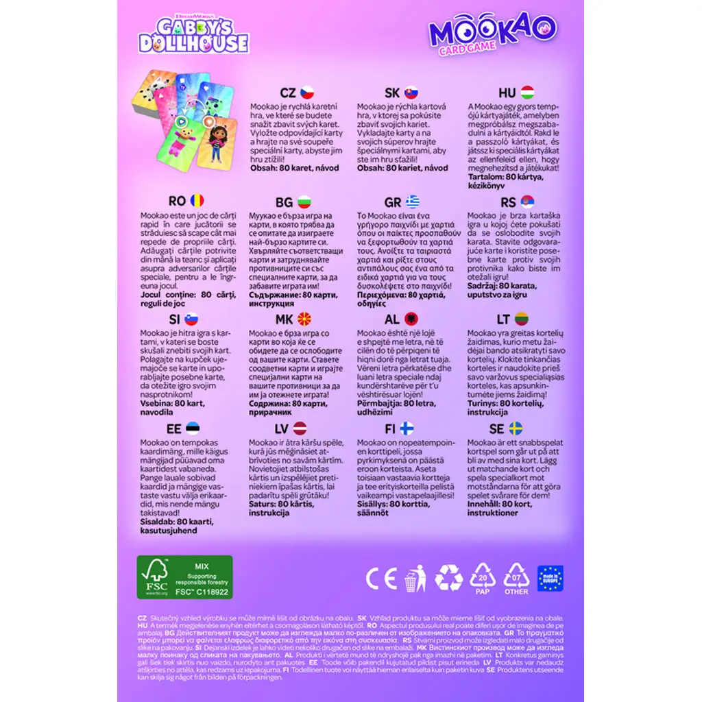 Pokud vaše dítě miluje kouzelný svět Gabiho domečku a rychlé, vzrušující karetní hry, pak je karetní hra Gabiho domeček Mookao pro něj ideální volbou. Tato zábavná, svižná hra funguje na podobných pravidlech jako klasické karetní hry, ale Gabi a jeho kočičí přátelé dělají kola ještě veselejšími a napínavějšími.