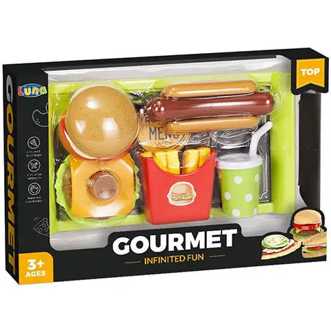 Téměř každé dítě miluje hamburgery, hranolky a nápoje z rychlého občerstvení, takže tento set bude jistě velkým hitem. Balení obsahuje hamburger, hot dog, porci hranolků, sklenici nápoje a dokonce i podnos, s nímž mohou děti v okamžiku proměnit dětský pokoj v úžasnou rychlou restauraci. S tímto setem si děti mohou skvěle procvičovat objednávání jídel typických pro rychlá občerstvení, jejich vydávání a také proces platby, čímž rozvíjejí sociální dovednosti dětí.