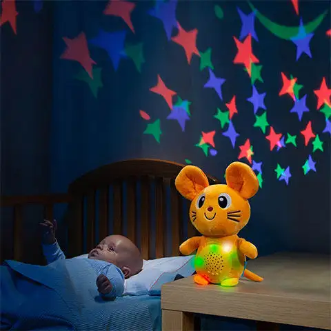 Tato malá myška bude skvělým společníkem pro spánek dětí, protože má hudbu a barevný projektor. V myši zabudovaný projektor promítá na strop barevné hvězdy, jejichž barva se mění, neustále se pohybují a pomalu pulzují. Milá, měkká plyšová myš, jejíž vnější textilní část je odnímatelná pro praní, protože hygiena je pro miminka velmi důležitá! Uklidňující ukolébavky zní z myši, aby miminka snadno usnula nebo aby je uklidnilo při pláči. Elektronika má automatické vypínání a časovač spánku. Hračka je schopna vydávat zvuky srdečního tepu, aby napodobila zvuk v matčině lůně a tím miminko uklidnila a pomohla mu usnout.
