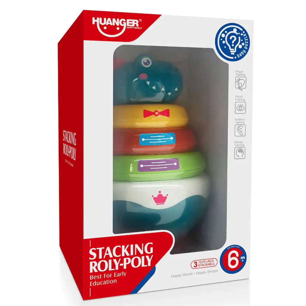 Stavební hra s dinosaurem je vzrušující a kreativní hra, která zaručeně zabaví malé děti. Hra je založena na polokulovité základně, takže se může kývat, a s pomocí základny lze snadno postavit věž. Věž lze postavit ze tří různě velkých a barevných kroužků, které se snadno nasazují na sebe.